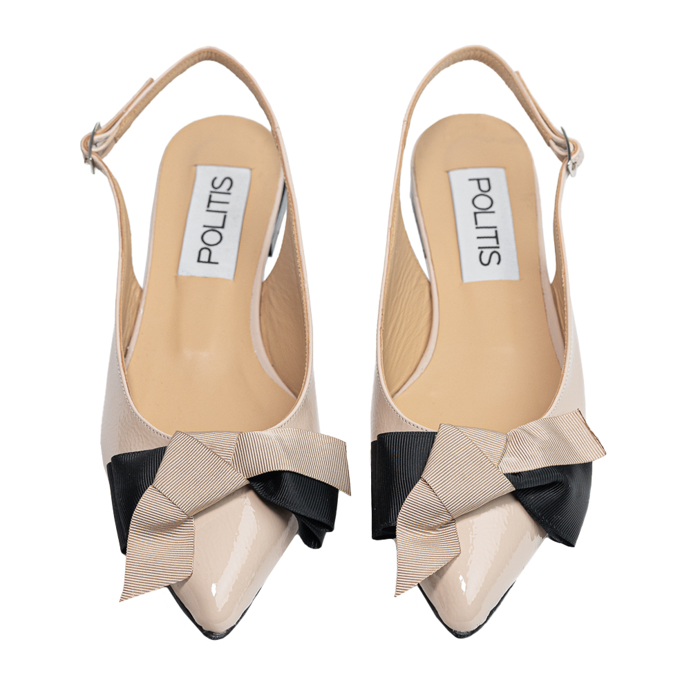 Beige-nude pointed leather slingback ballerina with bi-color black-beige bow