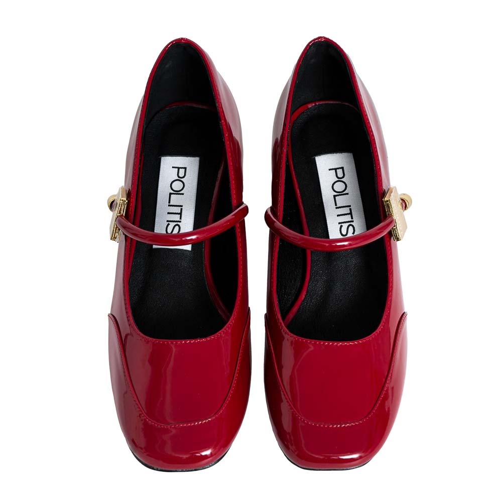 Bordeaux patent naplak pump Mary Jane with gold ornament