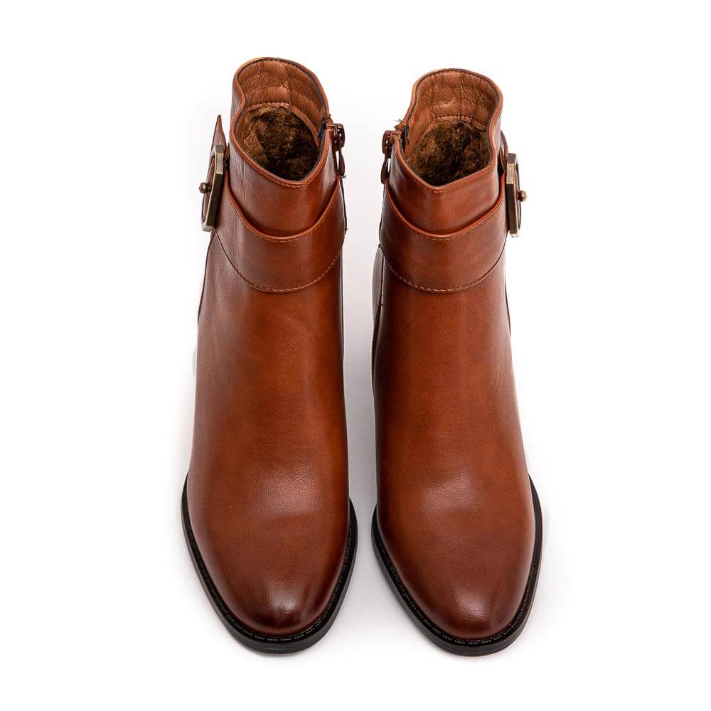 Tabac ankle boots with bronze ornament. Leather line. Zipper at the inner side. Heel 6 cm.