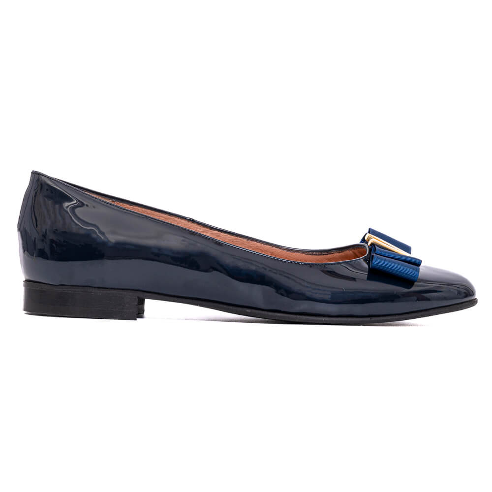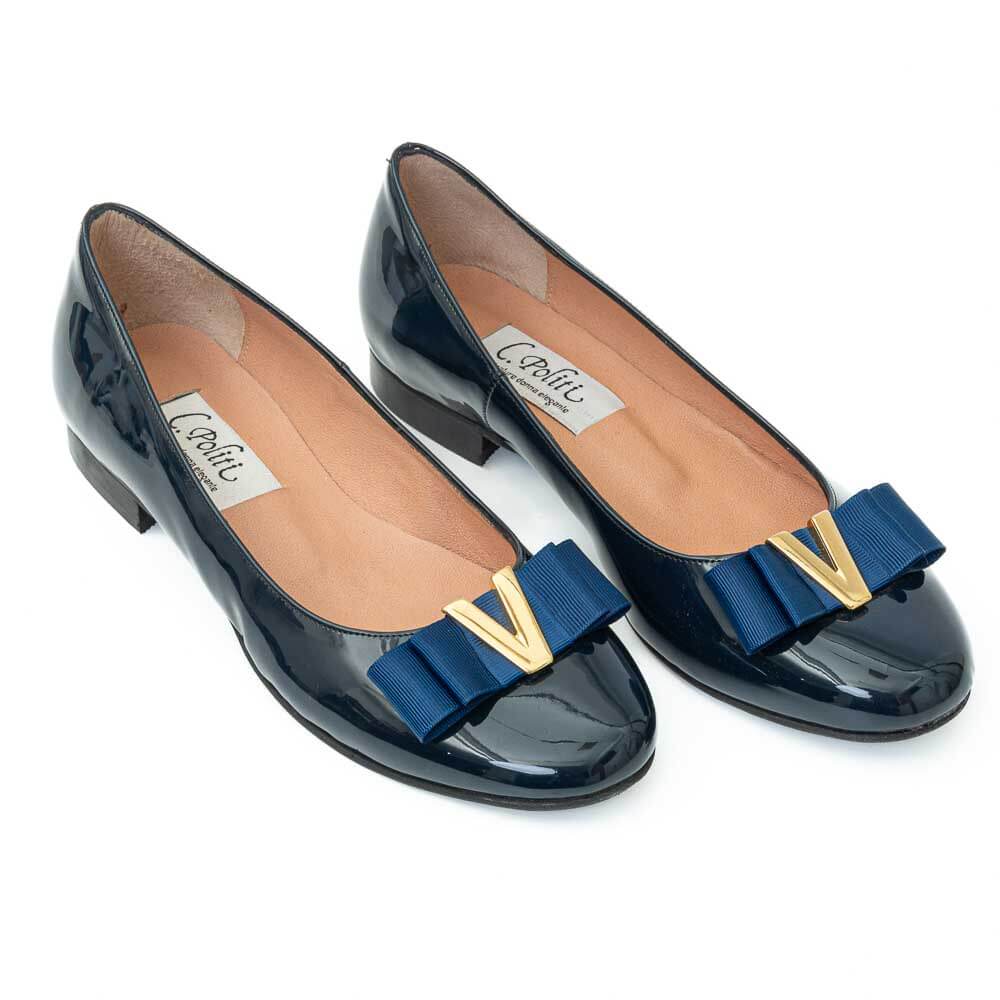 Μπαλαρίνες μπλε λουστρίνι με ιδιαίτερο χρυσό διακοσμητικό . Δερμάτινη φόδρα εσωτερικά . Δερμάτινος ανατομικός πάτος .