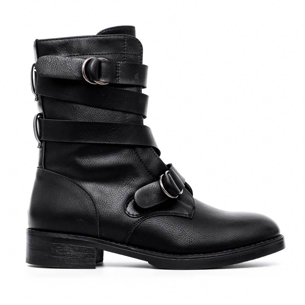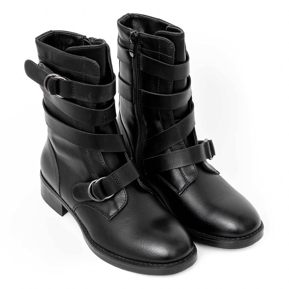 Μαύρο μποτάκι με λουριά και αγκράφες, δερμάτινη φόδρα, φερμουάρ στην εσωτερική πλευρά