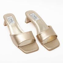 Mule χρυσό με ιδιαίτερο τακούνι . Δερμάτινη φόδρα . Ύψος τακουνιού 40 mm .