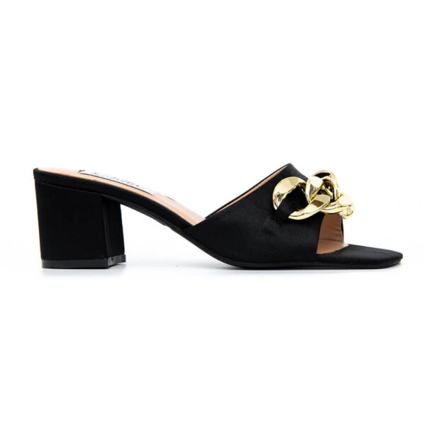 Mule μαύρο σατέν με χρυσούς κρίκους . Δερμάτινη φόδρα . Ύψος  τακουνιού  60 mm .