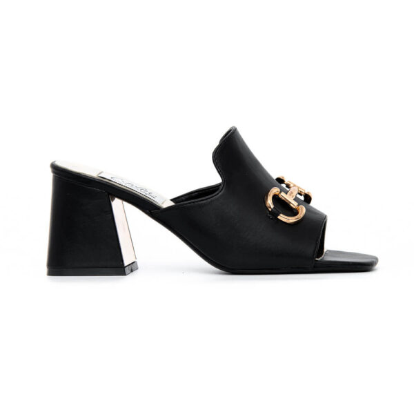 Mule μαύρο με χρυσό διακοσμητικό . Δερμάτινη φόδρα . Ύψος 70 mm .