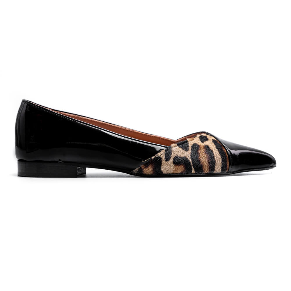 Μαύρη δερμάτινη λουστρίνι μυτερή μπαλαρίνα με γνήσιο λέοπαρντ pony skin .