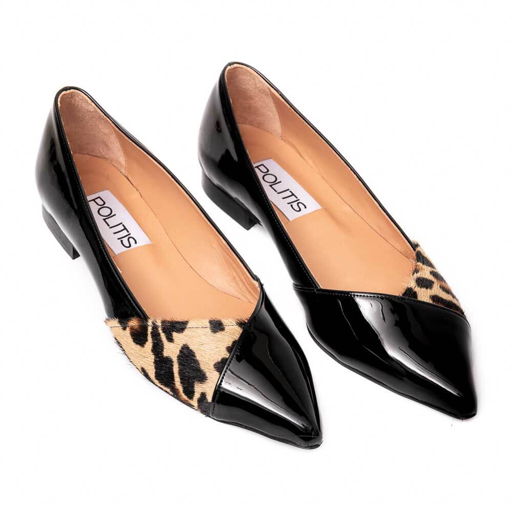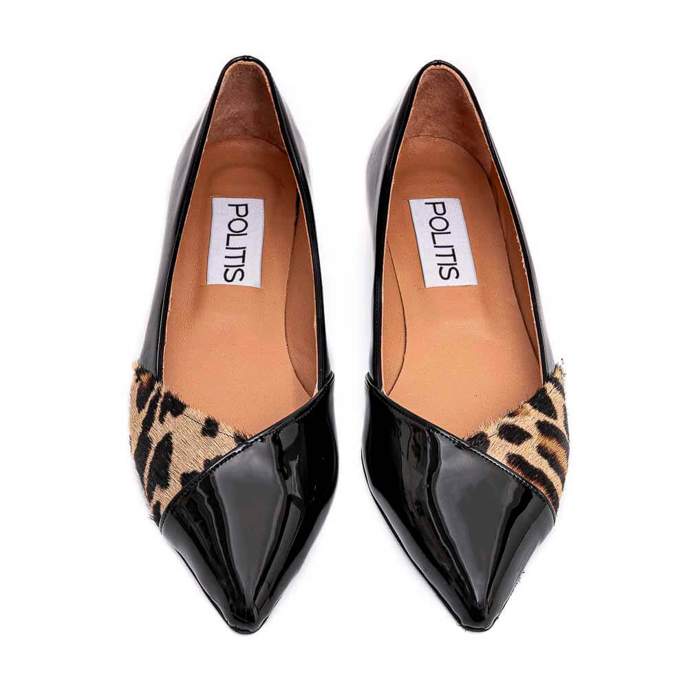 POLITIS Mαύρη μυτερή μπαλαρίνα με λέοπαρντ pony skin