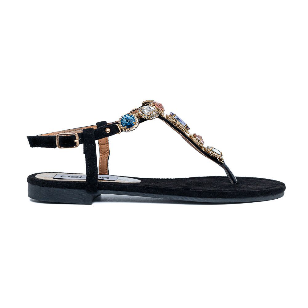 Μαύρο σανδάλι φλάτ με πολύχρωμες πέτρες .